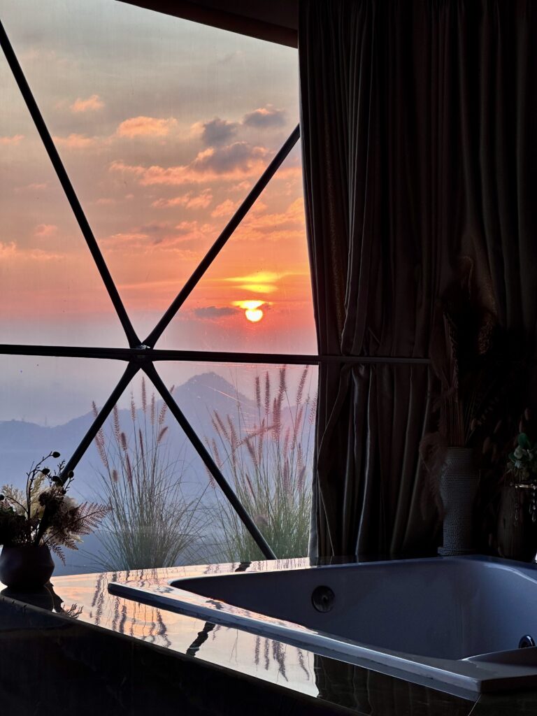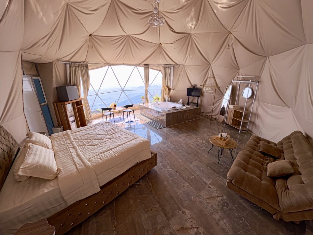 Indulge in refined luxury with elegantly designed modern interiors, premium bedding, and breathtaking mountain vistas. Perfect for discerning solo travelers or couples seeking comfort and sophistication. Ideal for honeymooners, this exclusive dome — the largest in Bandung — features a luxurious bathtub, creating an unforgettable romantic escape.